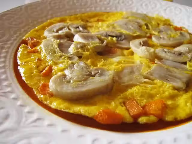 3、將打好的雞蛋倒入鍋中,稍等雞蛋液開始凝結時,將蘑菇均勻的鋪在蛋餅上