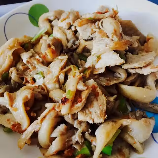 2、熱鍋涼油,爆香蔥花,下肉片炒至變色,下入蘑菇快速炒勻,加入生抽、蚝油和少量鹽,炒勻點麻油拌勻出鍋。