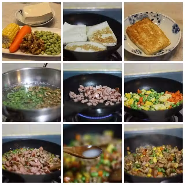 9、把核桃和雜菜炒熟,放在豆腐片上面