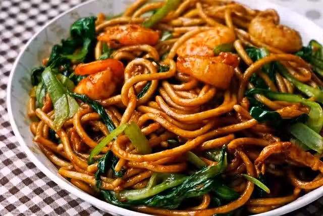 5、將鍋內肉絲蝦仁盛出,利用剩餘的油炒熟雞蛋,倒入肉絲蝦仁,將煮好的麵條放入鍋內,翻炒,延鍋壁倒入調製好的醬油,翻炒至麵條上色均勻,加入雞毛菜,用筷子翻炒至雞毛菜去生便可出鍋。