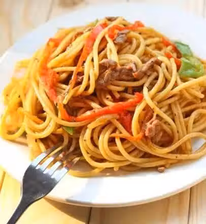 義大利面250克;牛裡脊肉100克;清水2000克;鹽2小勺;生粉5克;料酒5克;老抽3克;植物油60克;青椒一個;紅椒一個;洋蔥半個;雞精1勺;黑胡椒碎10克;生抽10克