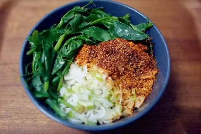 麵條200g、辣椒麵、蒜苗(也可加薑末 蒜末)可任選、蔥、香醋(陳醋會過酸)1大勺、鹽、醬油2滴、青菜、豆芽、油2大勺