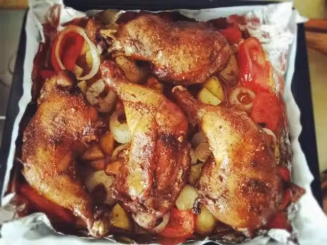 蔬菜不能與雞腿一同腌制,那樣會使蔬菜出很多水,就不會好吃了。烤制之前再放蔬菜就可以,蔬菜會吸收雞腿的湯汁。