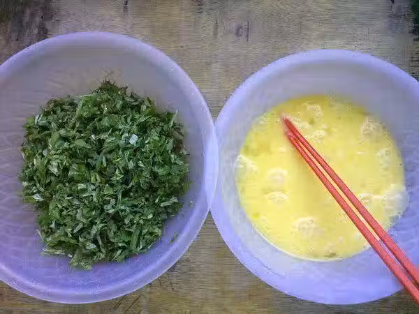 1、準備新鮮的艾葉,洗乾淨,艾葉揀去雜質,去梗,泡水。洗凈艾葉,艾葉切碎,小盆里打入3個雞蛋,打散。