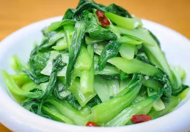 3.鍋內再燒油,放入蒜末、干辣椒段煸炒出香味,倒入上海青,大火顛鍋翻炒吸收蒜香味,加入雞粉、食鹽調味,大火爆炒30秒鐘,一定要用大火,火小的話容易出水。