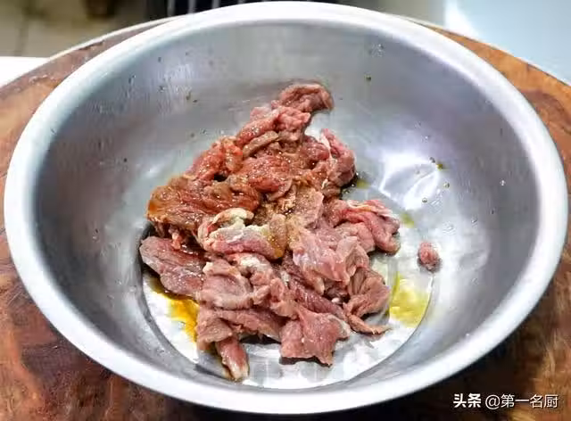 3、再打入一個蛋清,用手抓勻,加入蛋清可以使肉片更加滑嫩,再抓入少許玉米澱粉拌勻,加入澱粉可以鎖住肉片裡面的水分,使肉片口感更嫩,最後再加入少許植物油,這樣可以避免肉片粘連。