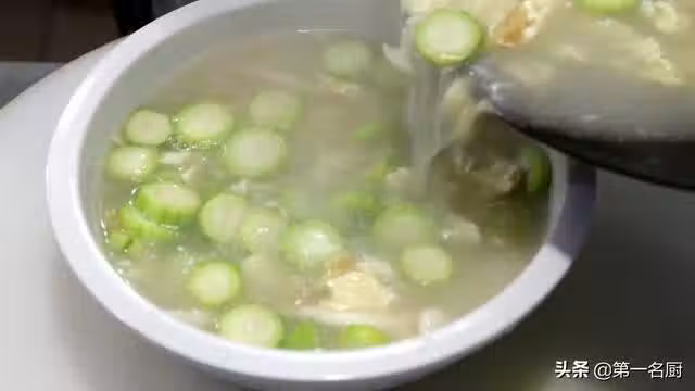 用勺子把大一些的雞蛋塊打散,燒開以後,下入白玉菇和絲瓜,開大火煮2分鐘左右,加入食鹽3克,雞粉1克,胡椒粉1克,再加入少許芝麻油增香,倒入湯盆中,美味即成。