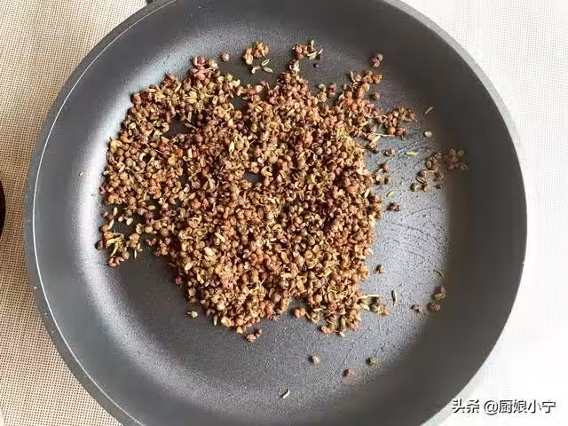 3、不停地翻炒,防止花椒和小茴香炒糊了,炒至花椒粒全部炒干炒至顏色變深,能用手指肚輕輕一捏就碎的程度就可以加入白芝麻和鹽了。