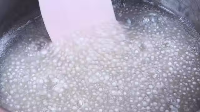 3.煮熟的西米真好看的,像珍珠一樣的,撈出後放入大碗中,加入涼開水過涼。