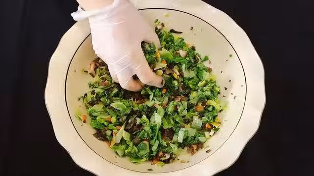 4、 將所有的蔬菜混合均勻,加入適量的鹽,然後用手搓成一個圓形;