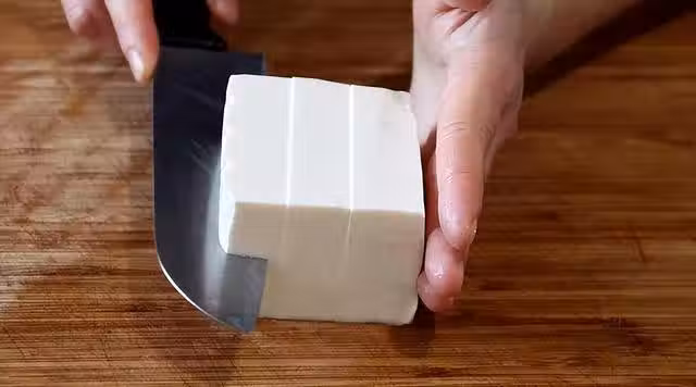 2、 然後將豆腐放在寬口的碗中,另取一個碗打入幾個雞蛋,打散之後倒在豆腐的碗中,用保鮮膜蓋住再戳幾個洞洞;