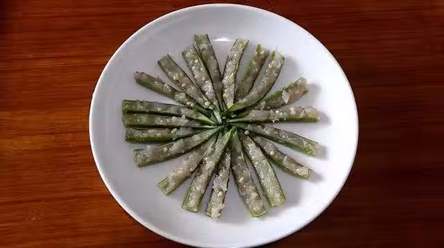 4、裝滿蝦肉的秋葵,一個個放在盤子中間,鍋中燒水,水開後,上鍋蒸15分鐘;