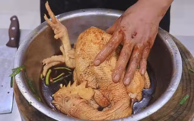 2、把雞肉腌制一下,放入小蔥段、生薑片、加入食鹽,里里外外抹均勻,加入胡椒粉、白糖、生抽、蚝油,適量紅燒醬油,抓拌均勻。給雞做全身按摩,把料汁塗抹在雞身上,最後把粘上料汁的蔥姜,直接塞進雞肚子裡面,再倒入適量的料酒,腌制30分鐘。