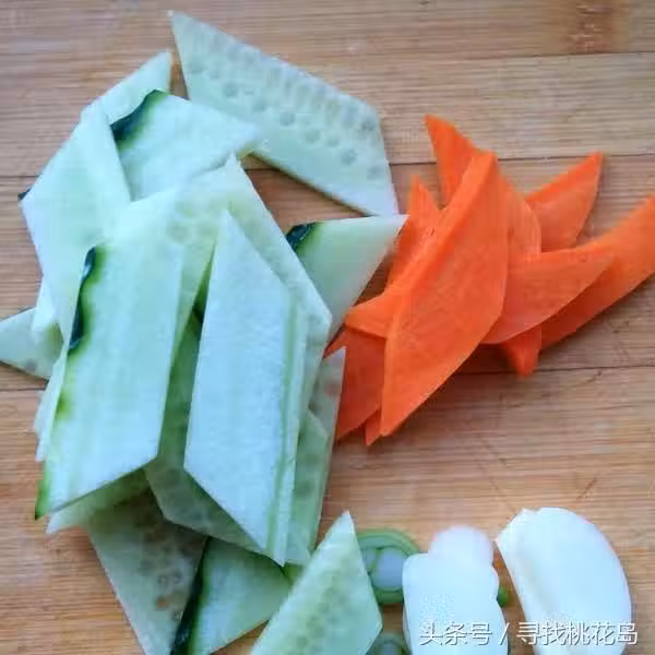 3. 腌肉的同時,將黃瓜和胡蘿蔔切菱形片,大蒜去皮切片,切蔥花備用。菱形片切法:把黃瓜斜著45度切成段,取一段立起來,直接直刀切,切出來的就是菱形片。