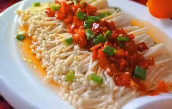 原料:金針菇300克、剁椒2湯匙、細香蔥2根、植物油1湯匙、蒸魚豉油1湯匙