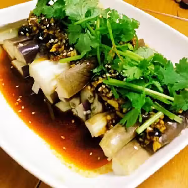 1、茄子去蒂洗凈入蒸鍋,隔水蒸10分鐘左右(茄子整條蒸可以防止吸收多餘的水份,筷子能輕易戳穿即表示蒸熟了);