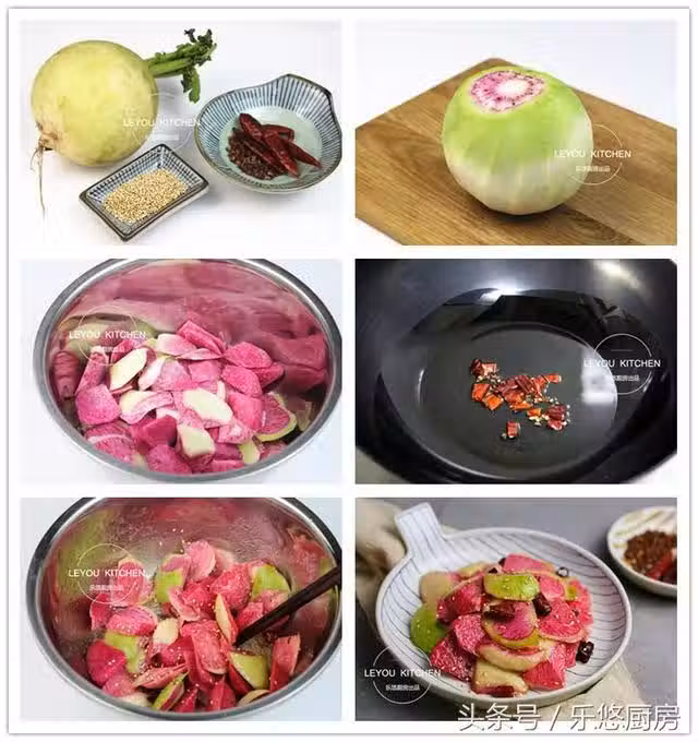 第四步:鍋中倒入少許油,油熱後把干辣椒和花椒和放入鍋中煸出香味。然後關火,將熱油連同辣椒和花椒一起倒入蘿蔔中。