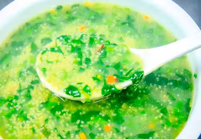 4.熬制期間,把鍋中的浮沫打幹凈,這樣煮出來的小米羹會更加的晶瑩清澈,大約熬制3分鐘,小米開花以後把芥蘭倒入鍋中攪拌均勻,繼續煮至小米羹微微燒開,勾入半勺芡粉,把小米羹調得稠一點,以免過於寡淡,小米羹再次煮開後即可出鍋,美味即成。