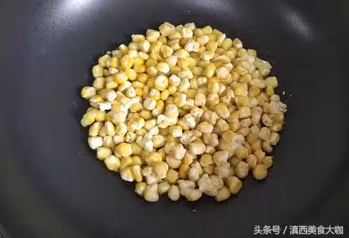 8 、加入油,油量沒過玉米粒,開中火繼續炸三分鐘左右,看見表皮酥脆成雪花狀即可關火。
