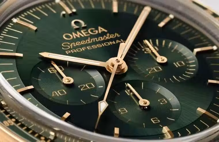 過往提到登月錶我們第一時間想到的就是黑色面盤,然而時代在變,手錶的設計也會做出與時俱進的改變,從2021年開始,歐米茄就針對Canopus Gold™金款式將面盤改為白色,到了2022年更上層樓陸續引進包含綠色在內的新色。這可能會引來兩極的評價:傳統派會認為登月錶面盤換了其他顏色就少了點歷史傳承的韻味,但是也有另一派的人則是樂觀其成,看到經典錶款可以出現過往未有的嘗試,有助於吸引更多手錶愛好者的注意,像是新款採用的綠色就是現在當道的一種主流色,而且歐米茄也並非只獨厚登月錶,綜觀品牌2022年各系列新品,像是海馬潛水300米、Speedmaster 57與Aqua Terra等都有綠面新作相繼問世。Moonshine™金登月錶採用的綠色是偏深綠的色調,看起來成穩而高雅,與高調的黃金色澤錶殼搭在一起形成鮮明對比感。而且面盤由於經過太陽放射紋修飾,所以綠色會隨著佩戴者轉動手錶的角度與光線照射而有深淺變化,看起來相當吸引人。