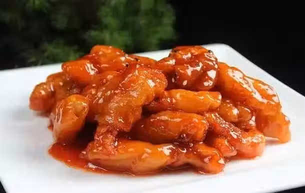 4.鍋留底油,烹入糖醋汁,倒入肉片,翻勺,淋香油出勺即可。