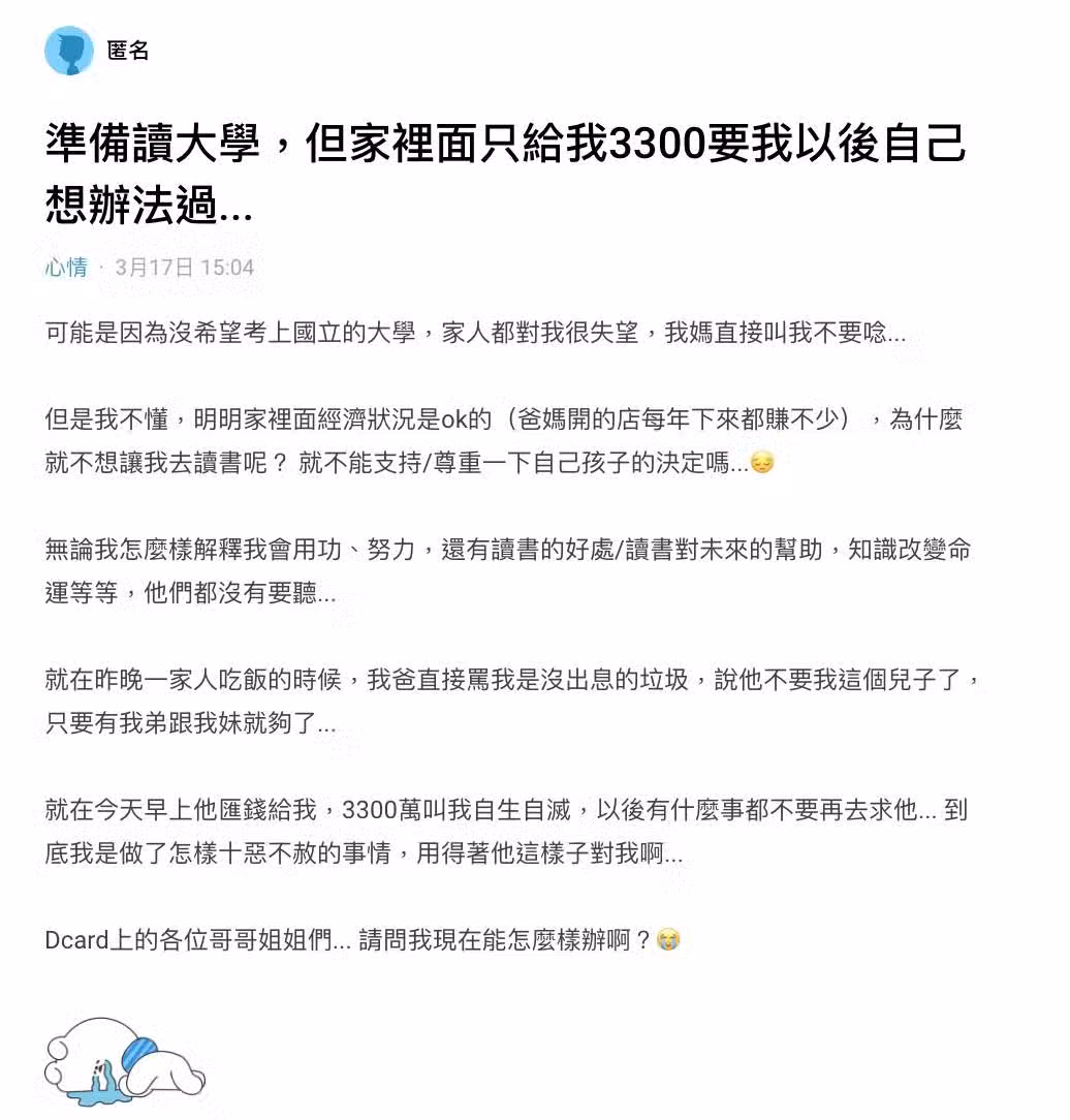 沒上國立大學!他被爸媽趕出家門「不要這個兒子了」 他崩潰喊「只給我3300萬」:要我自生自滅