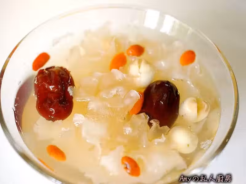 紅棗100克,銀耳(白木耳)50克,蓮子100克,黑糖(紅糖)適量,水450 ml。