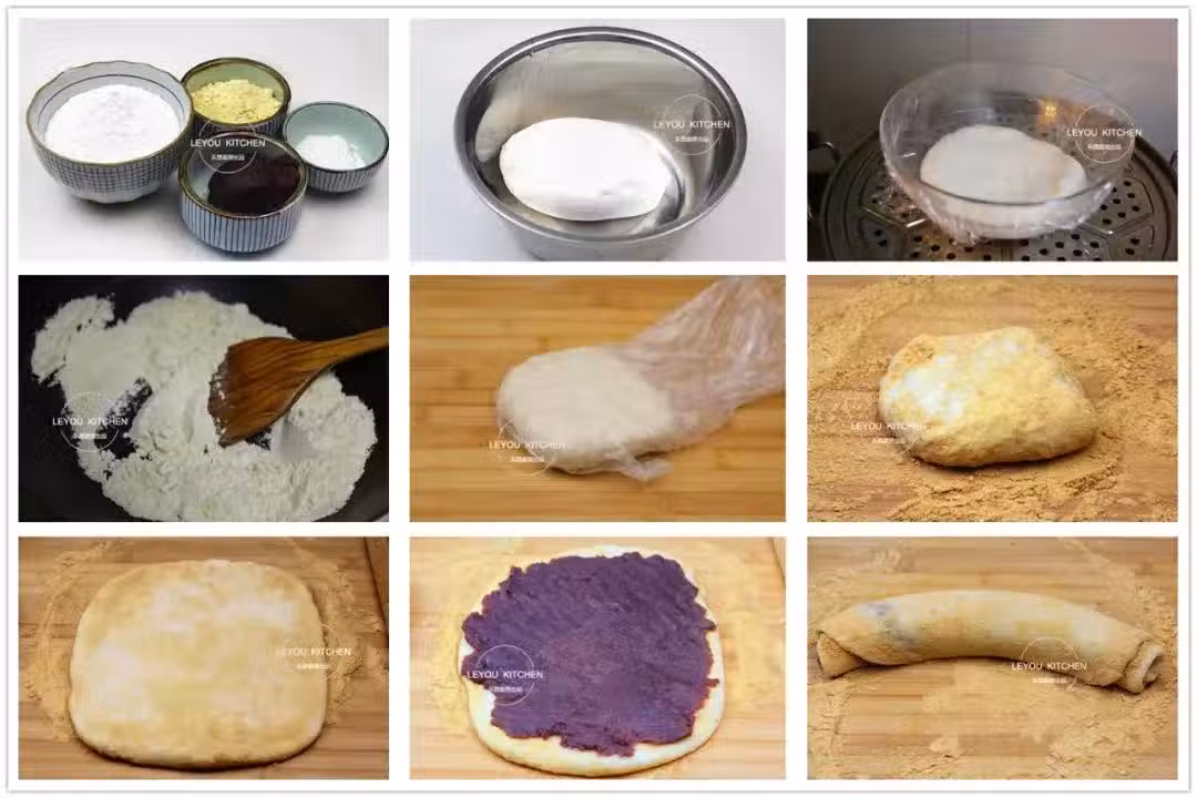 第四步:在蒸糯米糰的時候,開始炒黃豆面。將黃豆面放到一個無油無水的鍋中,然後小火開始不停的翻炒。炒至顏色變深,有一股糊味,但切記不要炒成黑色的。 第五步:糯米麵團蒸好後放入保鮮袋中,揉勻。(放入保鮮袋中可以很好的防粘) 第六步:面板上撒一層黃豆面,然後將糯米麵放到面板上,再撒一層黃豆面,如圖。 第七步:撒成薄厚勻均的麵餅,如圖。 第八步:把豆沙勻均的抹在麵餅上,如圖。 第九步:由一頭開始捲起來,如圖。 第十步:吃的時候,切成塊即可。另外,還可以再多撒一些黃豆面,味道更好哦。