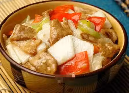 2.熱鍋上油,油熱後下入腌好的肉片滑散後盛出備用。余油再次燒熱,下大蔥絲煸香,倒入瀝干水份的山藥片,紅椒片炒勻,調入鹽調味。倒入滑好的肉片,加雞精,白鬍椒粉提味後起鍋即可。