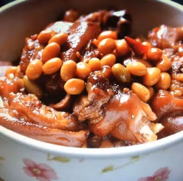 倒入開水,加入泡好的黃豆,燒開後轉小火,燉1.5小時至豬蹄酥軟後,大火收汁即可;