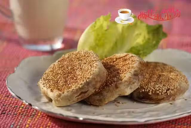 12. 將它按壓在芝麻中; 13. 餅子表面都沾滿了芝麻, 按壓一下固定; 14. 電餅鐺上下烤盤刷層薄油,預熱;15.