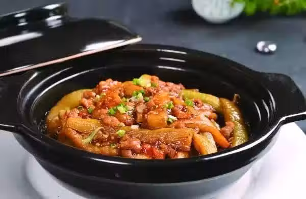 9、放入蝦球和茄子,中火燒三分鐘,中間稍微翻動一下,然後汁差不多快沒了,勾芡出鍋。