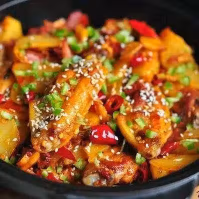 3、炒鍋熱油後下雞翅和土豆條,至土豆和雞翅略微焦黃完全成熟,再下藕片翻炒。下花椒和干辣椒抄香,再下香辣醬,最後講調料汁倒入,到濃稠收汁即可。