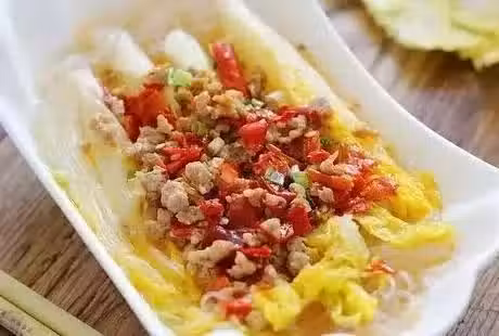 8.把炒好的剁椒肉末均勻的澆在娃娃菜上