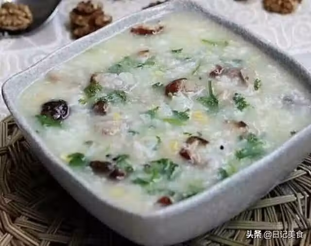 4、玉米粒和鮮菇片放進粥里,小火煲15分鐘;