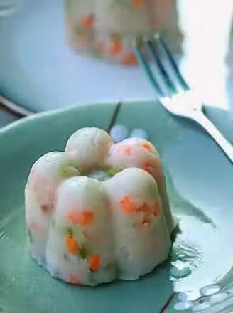 5.準備好果凍模,在內壁塗上一層香油,然後填入混合山藥泥,用勺子壓緊,再倒扣在盤中,即可開吃拉