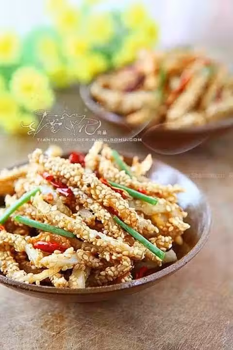 3.取小點的鍋入油燒五六成熱,依次下入藕條炸成金黃色。將炸好的藕條瀝油撈出;鍋內放入少許油,小火炒香花椒和干紅椒、薑片;放入藕條,再加少許鹽炒勻,最後加入少量香油、花椒油翻炒片刻即可