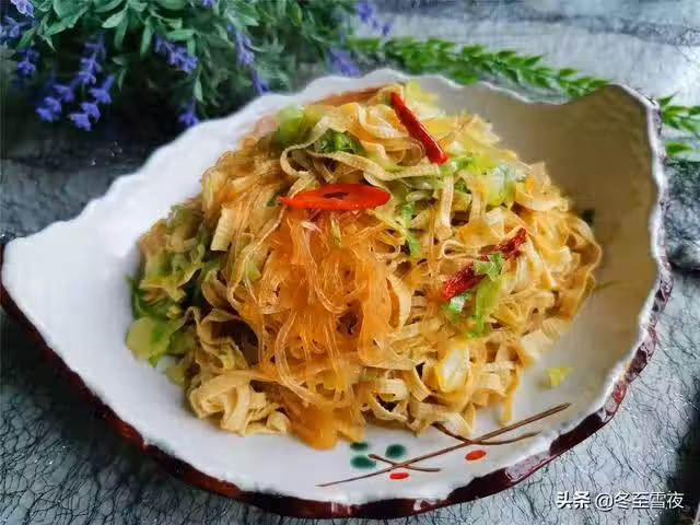 【包菜炒三絲】所需材料:包菜半顆、干豆腐2張、粉絲1把、油鹽適量、蔥1段、姜2片、大蒜2瓣、花椒10幾粒、干辣椒4-5個、生抽1湯匙、