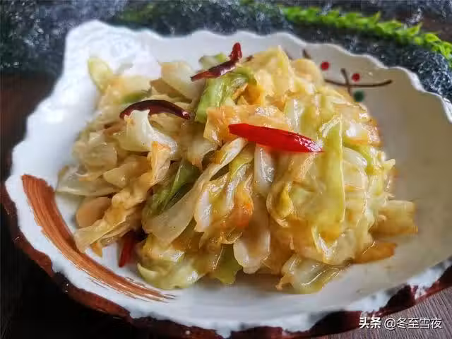 5.下入包菜大火翻炒至顏色變深綠,呈半透明狀,至斷生即可