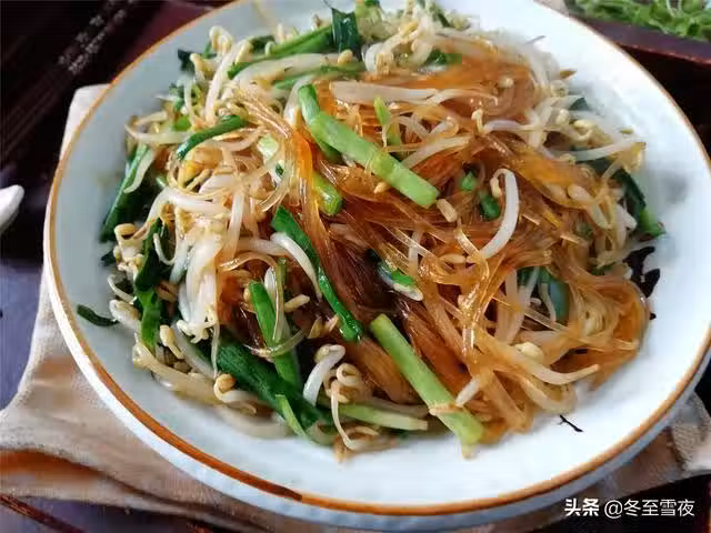 【綠豆芽韭菜炒粉絲】所需材料:綠豆芽250克、韭菜1小把、粉絲1把、油鹽適量、醬1片、大蒜2瓣、雞精1茶匙、米醋幾滴