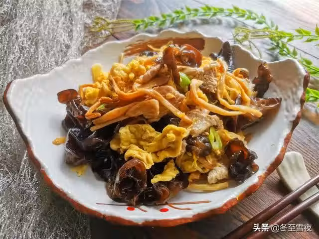 【木須肉】所需材料:雞蛋2個、黑木耳(干)1把、金針菇(干)1把、豬肉150克、油鹽適量、蔥1段、姜2片、大蒜2瓣、料酒半湯匙、白鬍椒粉半茶匙、澱粉,半湯匙。