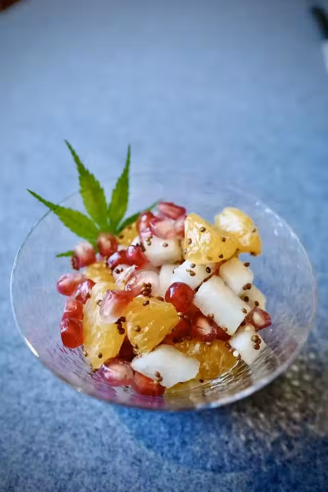 製作方法:石榴取籽,梨和橙切成大小相近的顆粒,三者混合,加一勺細糖霜、梅滷水和腌漬過的紫蘇籽,拌過。