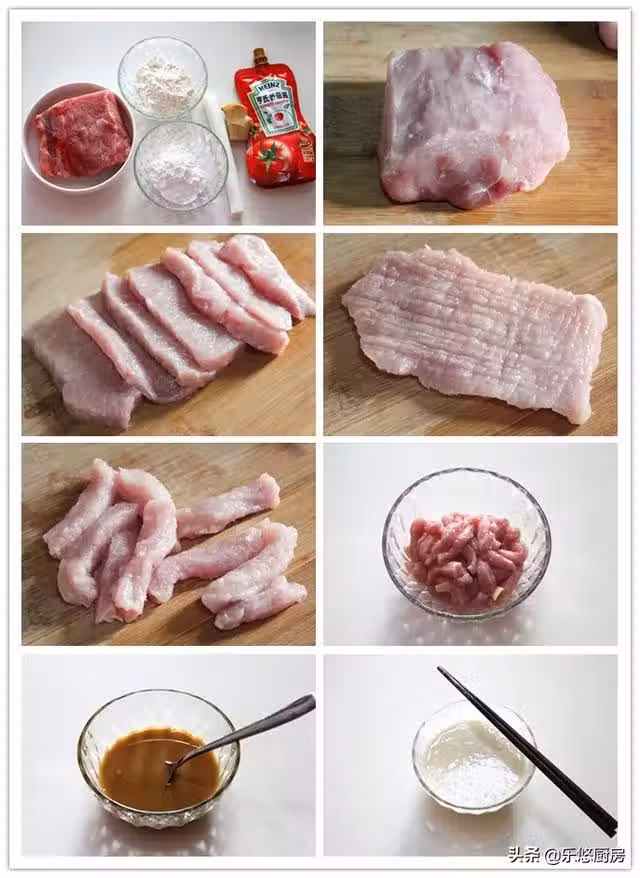 第五步:將肉片切成1厘米寬,4-5厘米長的肉條。