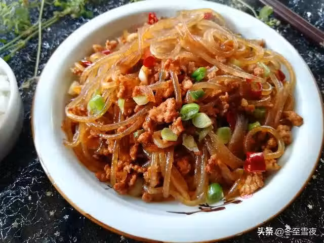 所需材料:粉條1把、豬肉150克、老乾媽1湯匙、油鹽適量、蔥1段、姜1片、大蒜2瓣、醬油1湯匙、料酒1湯匙、