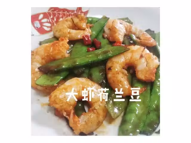 荷蘭豆200克;厄瓜多白蝦(大)5隻;姜3片;蒜3瓣;小米辣2個;橄欖油1勺