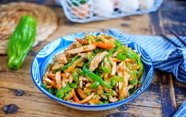 青椒4個;榨菜絲2包(大概160克左右);香乾3塊;瘦肉100克;生抽2-3湯勺;食用油適量;鹽少許(可放可不放);紅薯粉1.5湯勺;料酒1湯勺;白糖少許;開水少許