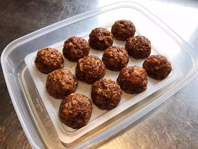 戴上烘焙手套把肉餡分成30克每個搓圓裝入盒中