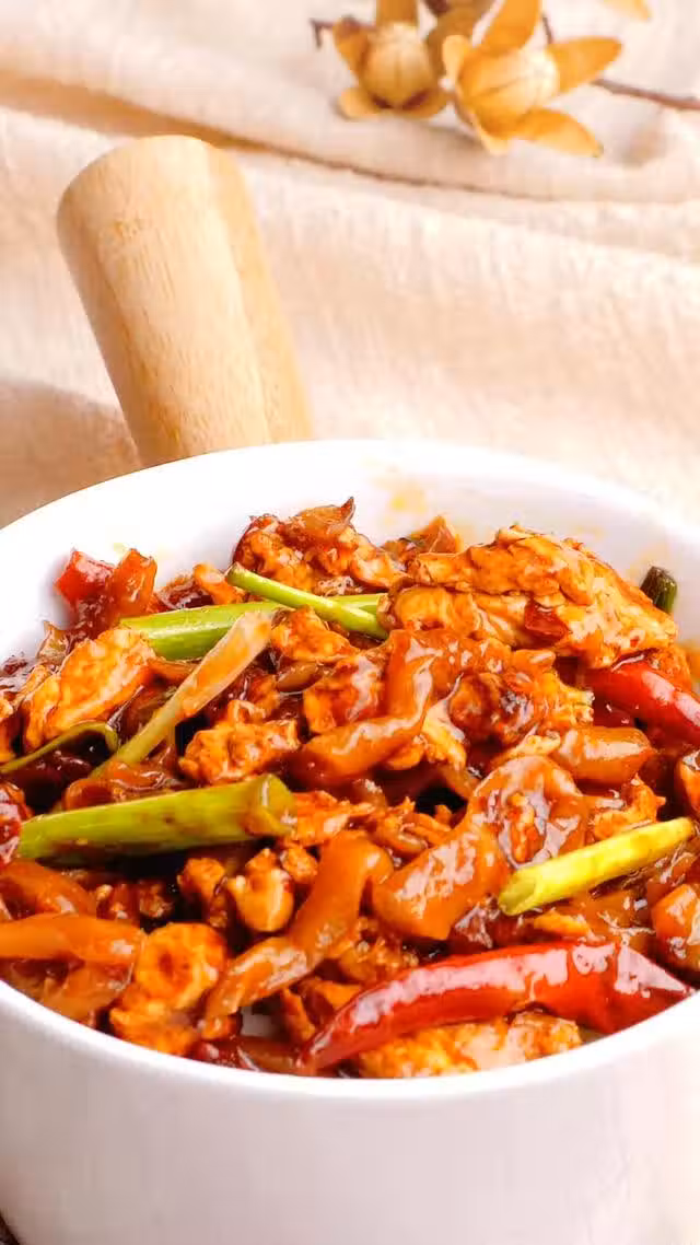 倒入榨菜、干辣椒、水、老乾媽、老抽,煮5分鐘。湯開了以後,倒入水澱粉讓湯汁濃稠,攪拌幾下,撒上蔥段,鹵就做好了。