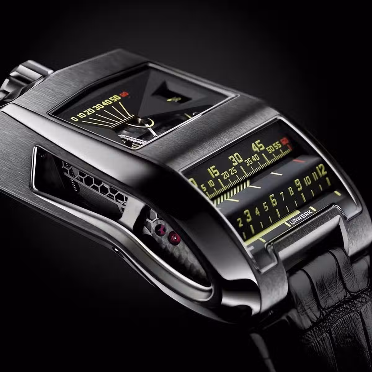 盡管可以戴在手腕上,但UR-CC1表殼和表盤與大多數其他手錶幾乎沒有相似之處。霓虹綠色顯示屏與18k白金表殼形成鮮明對比。一種版本的眼鏡王蛇手錶甚至在白金上塗上一層黑色塗層,完全隱藏起來,只讓佩戴者知道表殼的真實材料。