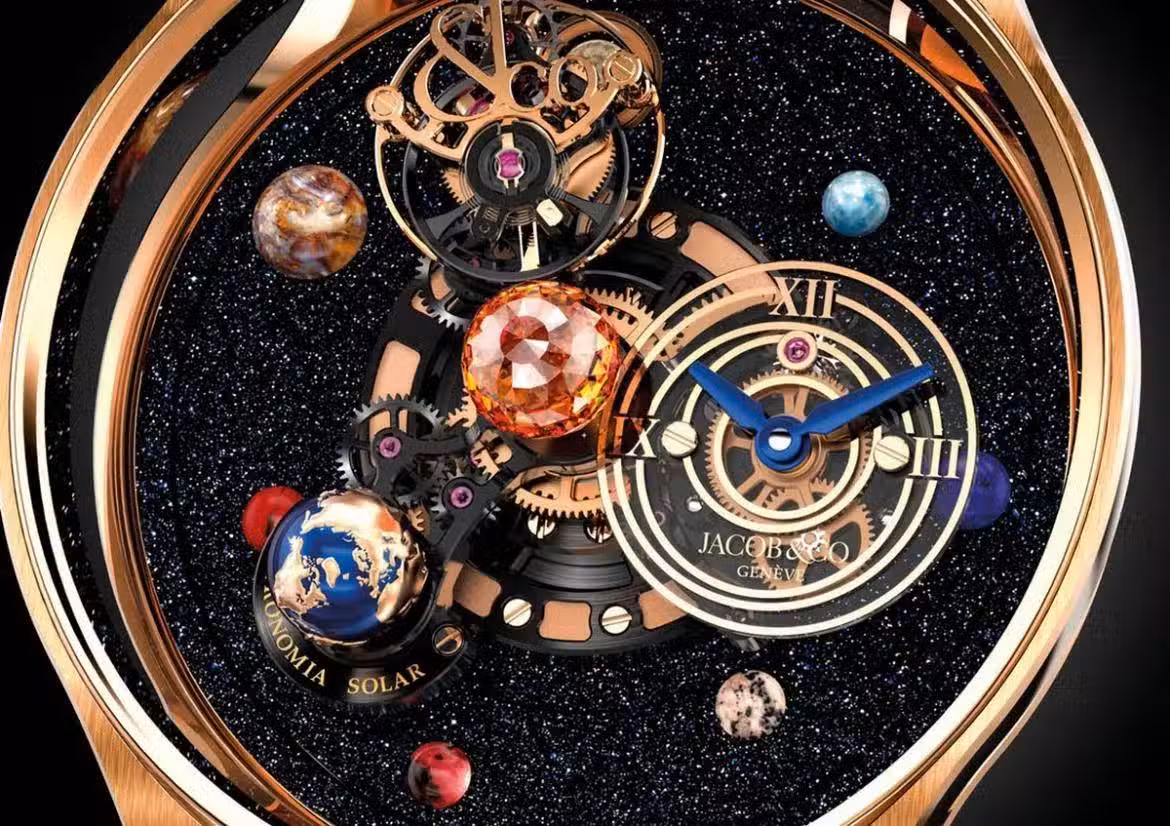 功能時分系統,三臂垂直運動,10分鐘內繞中軸旋轉一圈,60秒飛行陀飛輪籠,玫瑰金和藍漆,地球在60秒內旋轉,小時和分鐘表盤,獲得專利的差動齒輪系統允許保持12/6點鐘位置,機芯頂部鑲嵌黃色Jacob cut®藍寶石(288刻面;約1.5克拉)。框架上裝有 3顆Jacob cut®,寶石有紫水晶、黃玉和橄欖石。